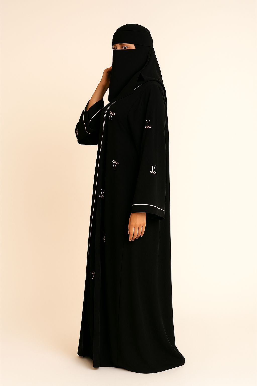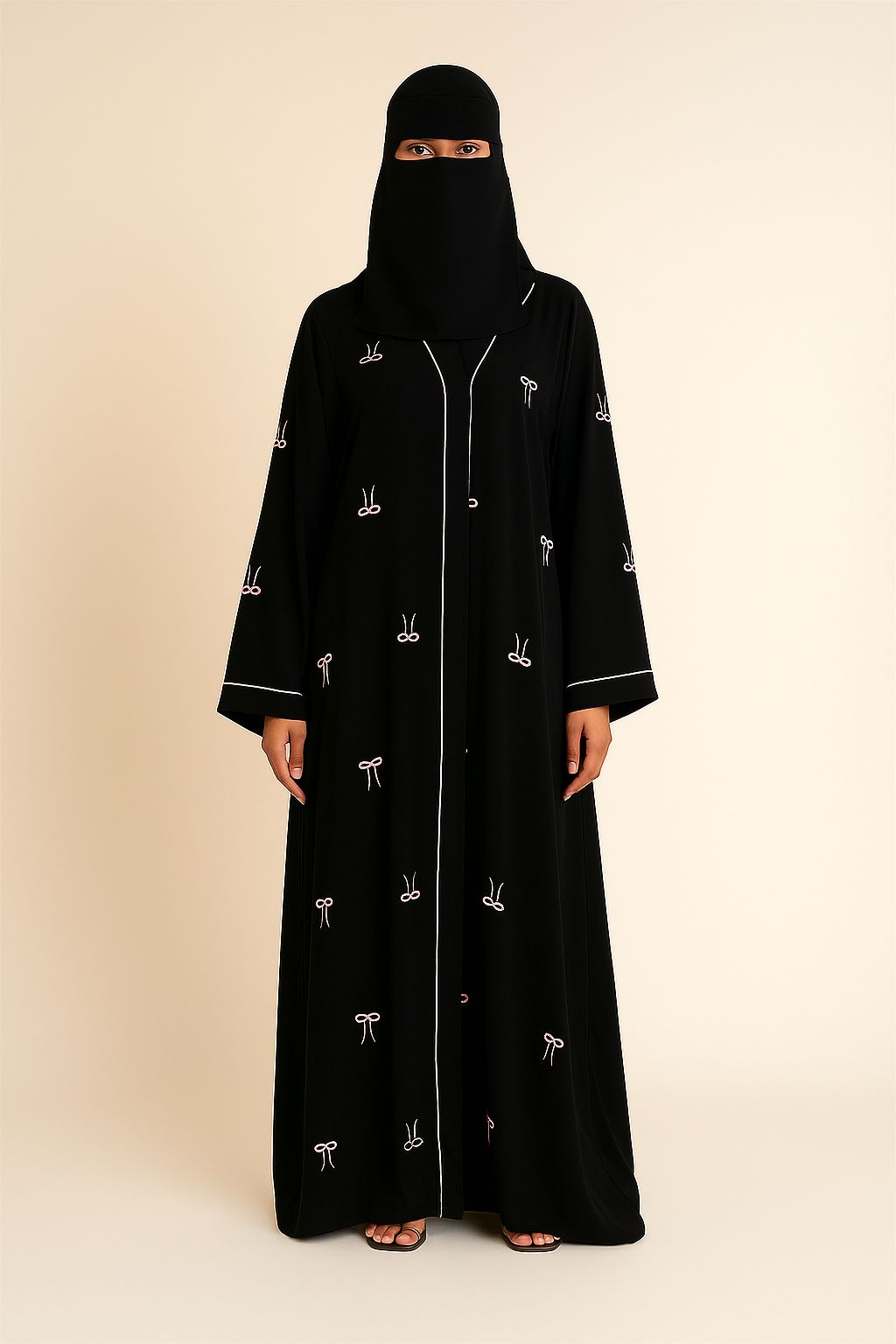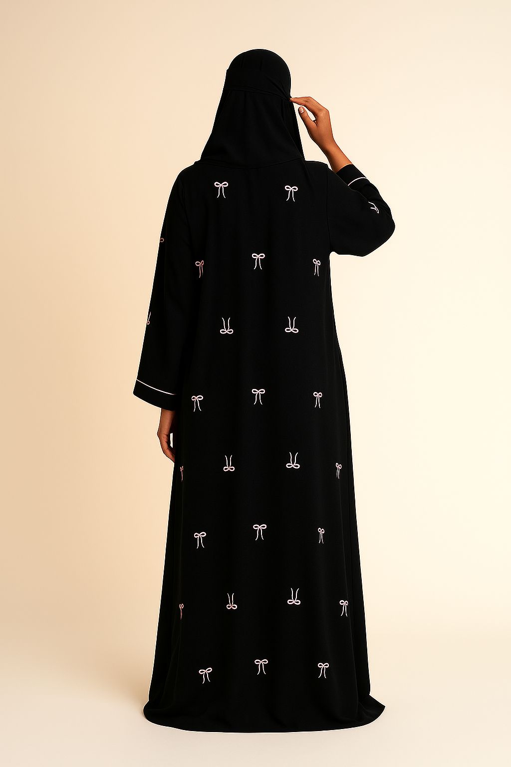 A stylish abaya adorned with delicate bow embroidery and soft pink piping, offering a fresh and feminine twist to classic modestwear.