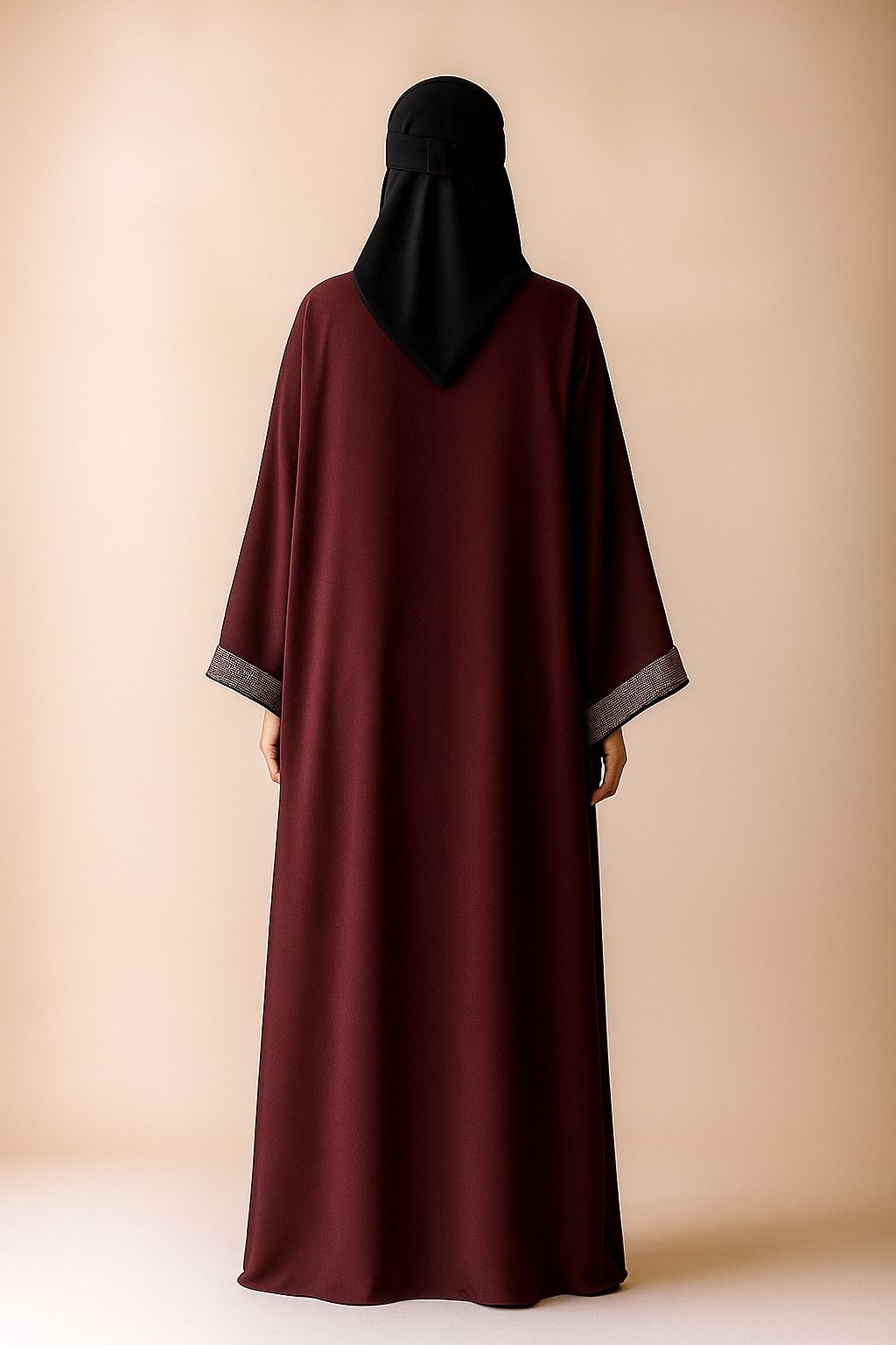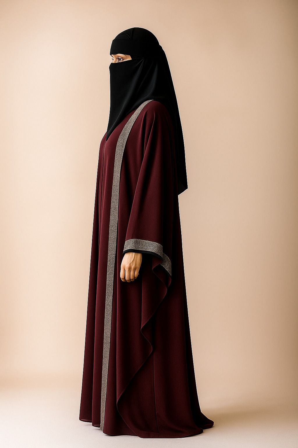 A sophisticated maroon abaya adorned with shimmering embellishments, paired with a sleek black niqab for a complete modest look.